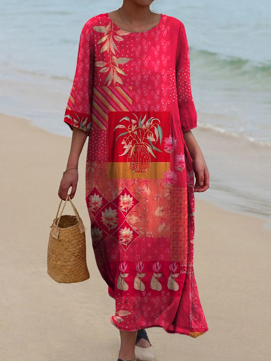 Retro Floral Art Print Vintage Chic con cuello en V botón de manga larga vestido de Midi